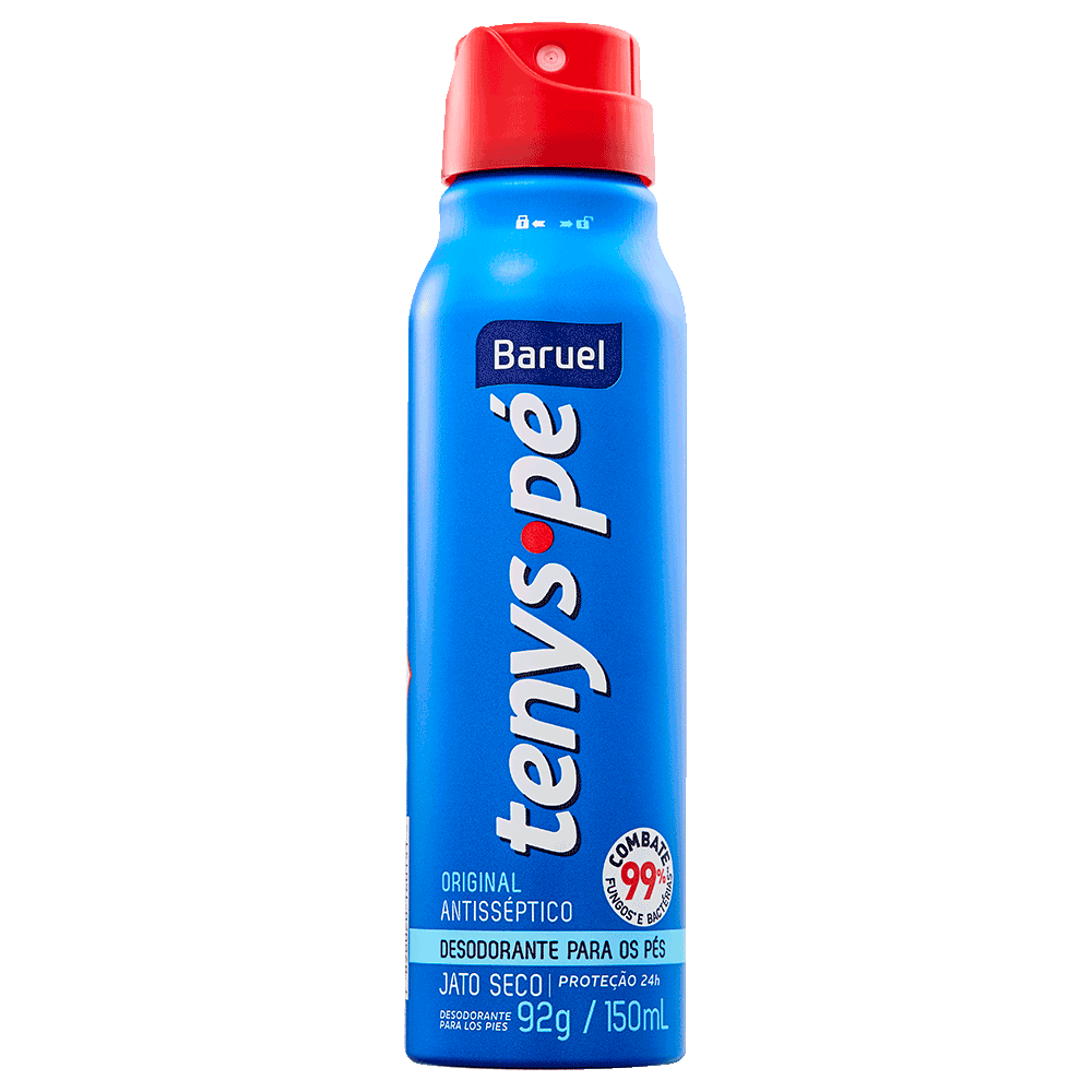 TENYS PÉ BARUEL JATO SECO Aerosol Jato seco antisséptico mantém os pés secos e protegidos. Não deixa resíduos nos pés. Tenys Pé Baruel Jato Seco combate os odores da transpiração, sua fórmula exclusiva com ação antisséptica e desodorante mantém os pés secos e perfumados.